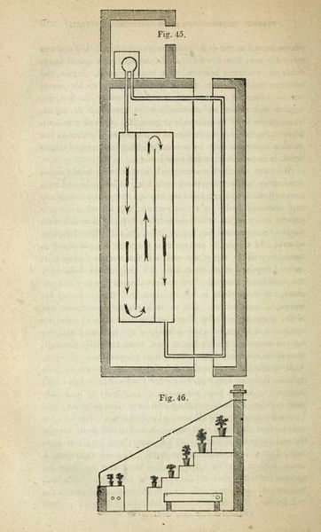 Robert B. Leuchars, A hothouse with a wooden tank, in which water circulates by various divisions, after it enters from the flow-pipe, in A Practical Treatise on the Construction, Heating, and Ventilation of Hothouses (1850), p. 216, figs. 45 and 46. Library of Congress, Washington, D.C.