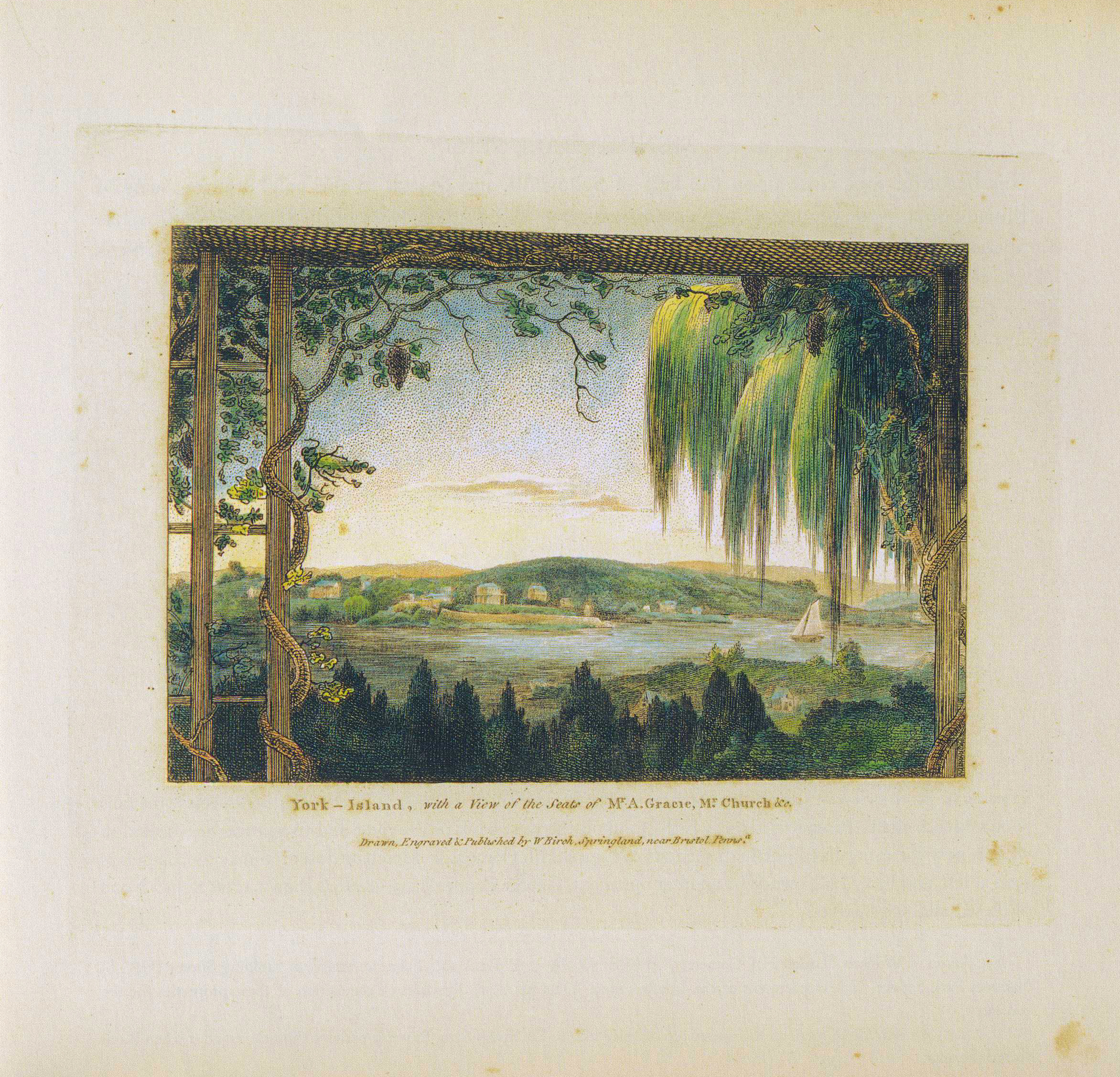 Inscription: York-Island, with a View of the Seats of M.r A. Gracie, M.r Church &c. / Drawn, Engraved & Published by W. Birch, Springland, near Bristol, Penns.a