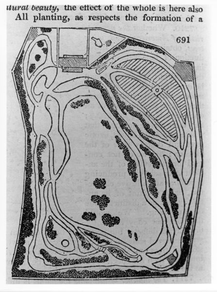J. C. Loudon, In planting with a view to natural beauty, in An encyclopædia of gardening; comprising the theory and practice of horticulture, floriculture, arboriculture, and landscape-gardening, including all the latest improvements; a general history of gardening in all countries; and a statistical view of its present state with suggestions for its future progress, in the British Isles. By J.C. Loudon. . . Illustrated with many hundred engravings on wood by Branston (1826), 1008, fig. 691. Library of Congress, Washington, D.C.